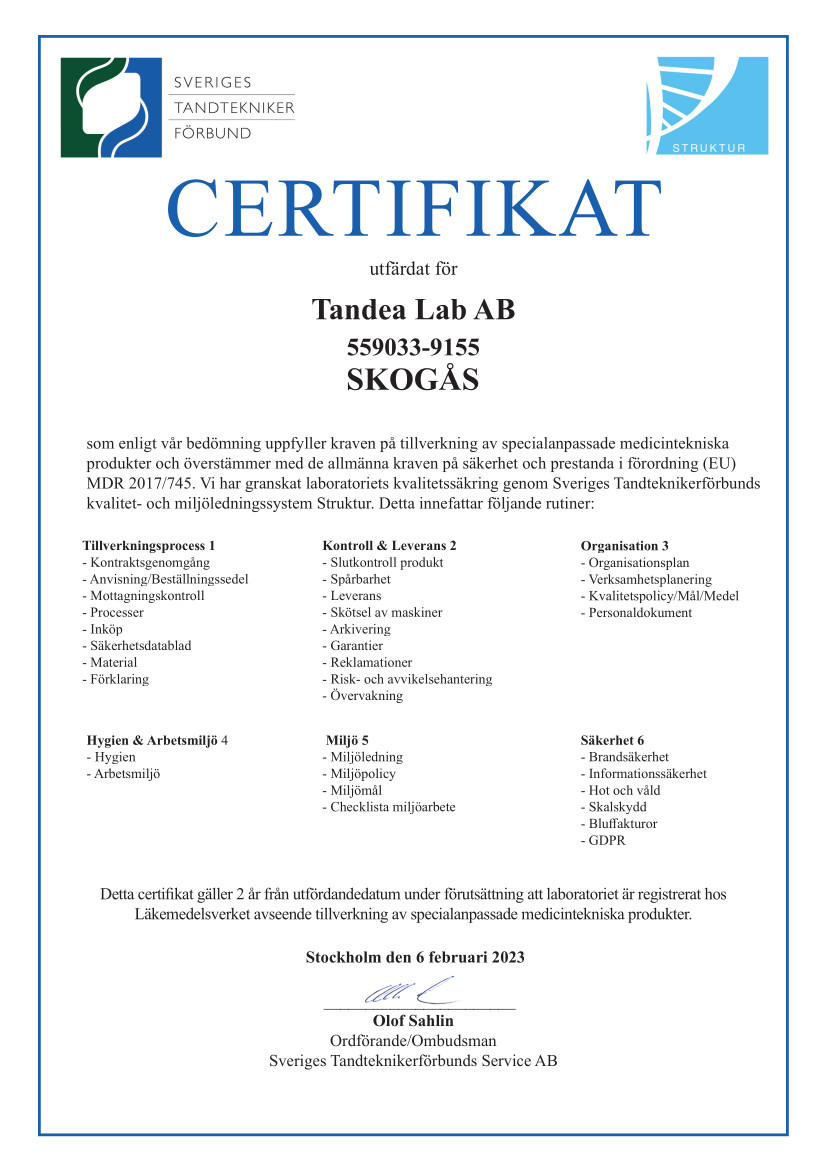Förutom service av världsklass satsar vi också på högsta kvalitet, inte bara på våra produkter, men även på att vi har ordning och reda på våra rutiner och processer. Sedan år 2020 är vi certifierade via tandtekniker förbundets kvalitet- och ledningssystem STRUKTUR. Vi uppfyller därmed kraven på tillverkning av specialanpassade medicintekniska produkter och överensstämmer med alla myndighetskrav på säkerhet och prestanda. Vi är den del av tandeagruppen